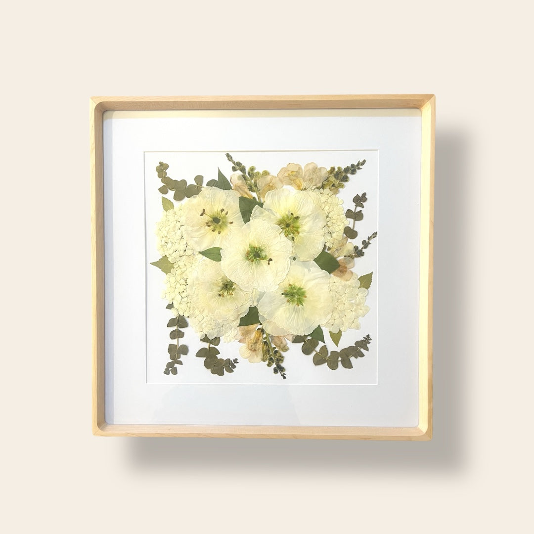 Each flower is carefully selected and pressed by hand to maintain its vibrant color and delicate details. Some blooms are even deconstructed petal by petal and expertly reassembled to capture their full beauty. Once dried, we thoughtfully arrange the flowers into a one-of-a-kind piece of art that reflects your special moment.