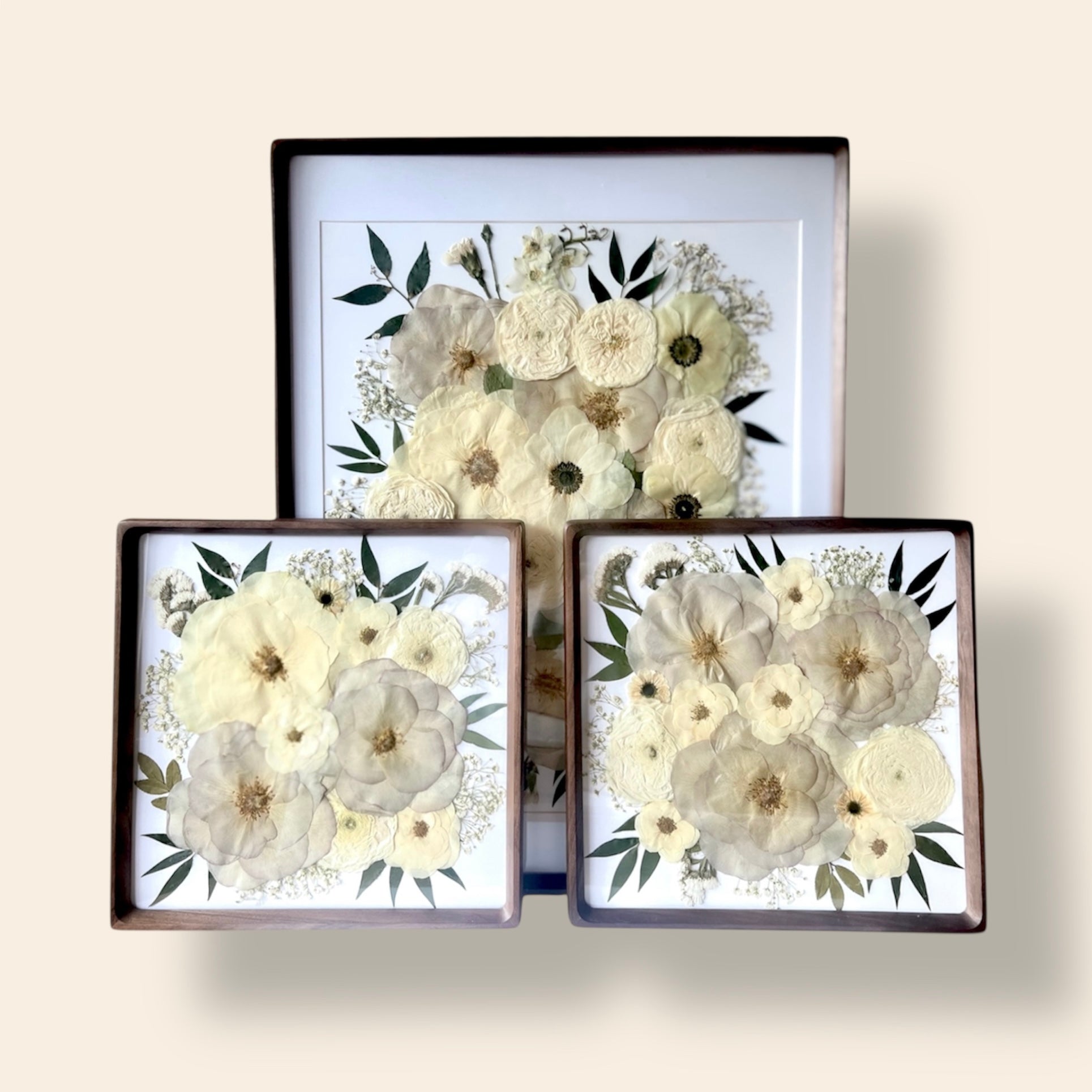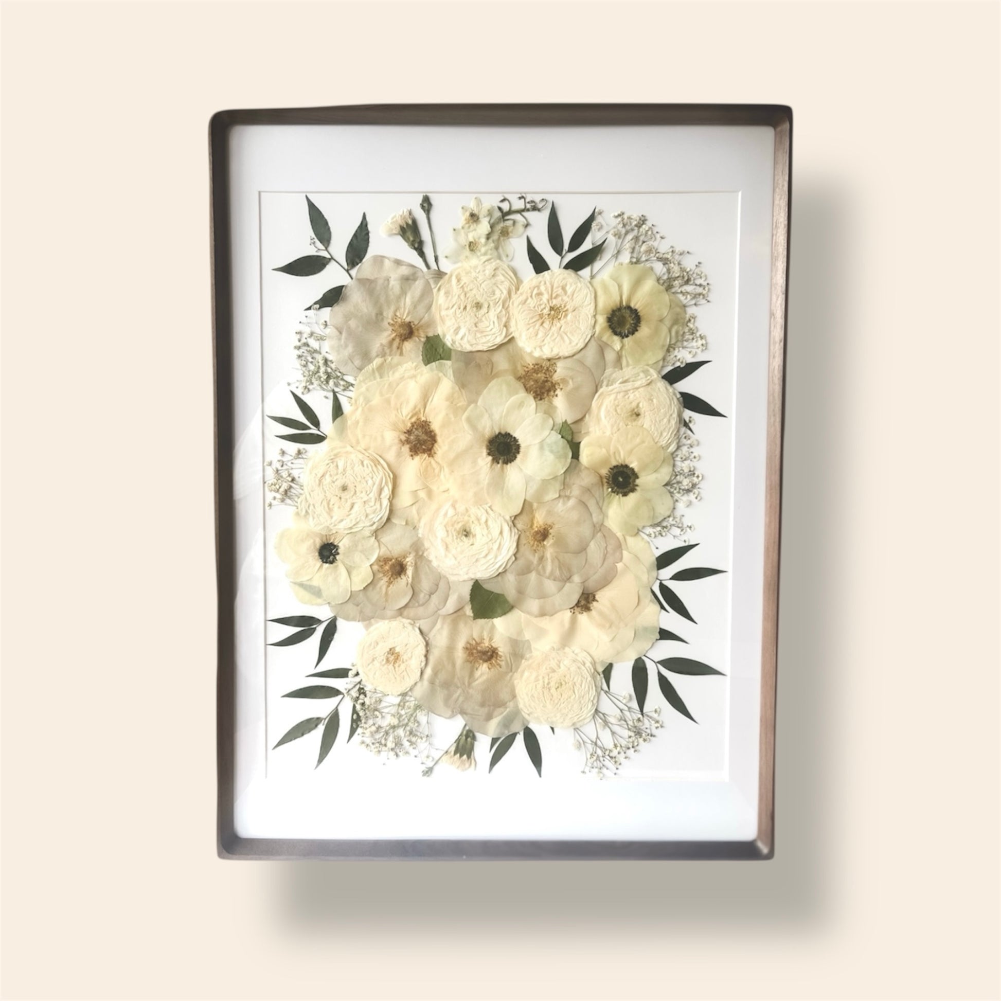 Each flower is carefully selected and pressed by hand to maintain its vibrant color and delicate details. Some blooms are even deconstructed petal by petal and expertly reassembled to capture their full beauty. Once dried, we thoughtfully arrange the flowers into a one-of-a-kind piece of art that reflects your special moment.