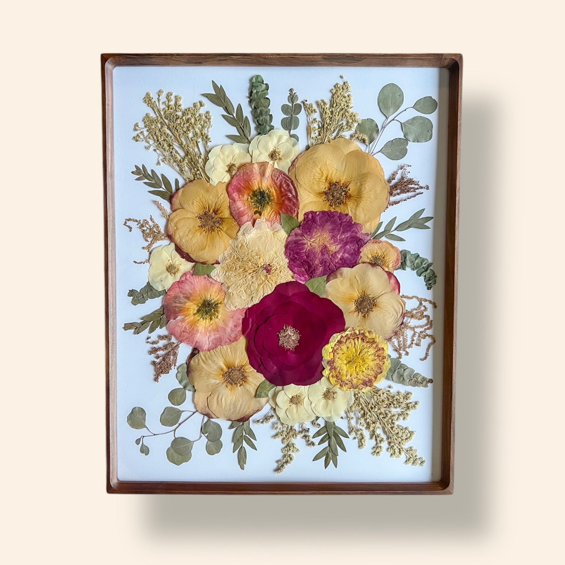 To reserve and secure a future bouquet preservation please do so here. The reservation fee will go towards the cost of your final frame. You do not need to make the decision of the size of your frame at this time. We will go over recommendations for sizing when we receive your fresh flowers. Once you have purchased your reservation please email pressedflorals614@yahoo.com with the following information: Name, date of event, contact information, and date off bouquet drop off. As well as any questions or concerns. When your final art piece is complete you will receive a discount code for $100 off the frame you select.